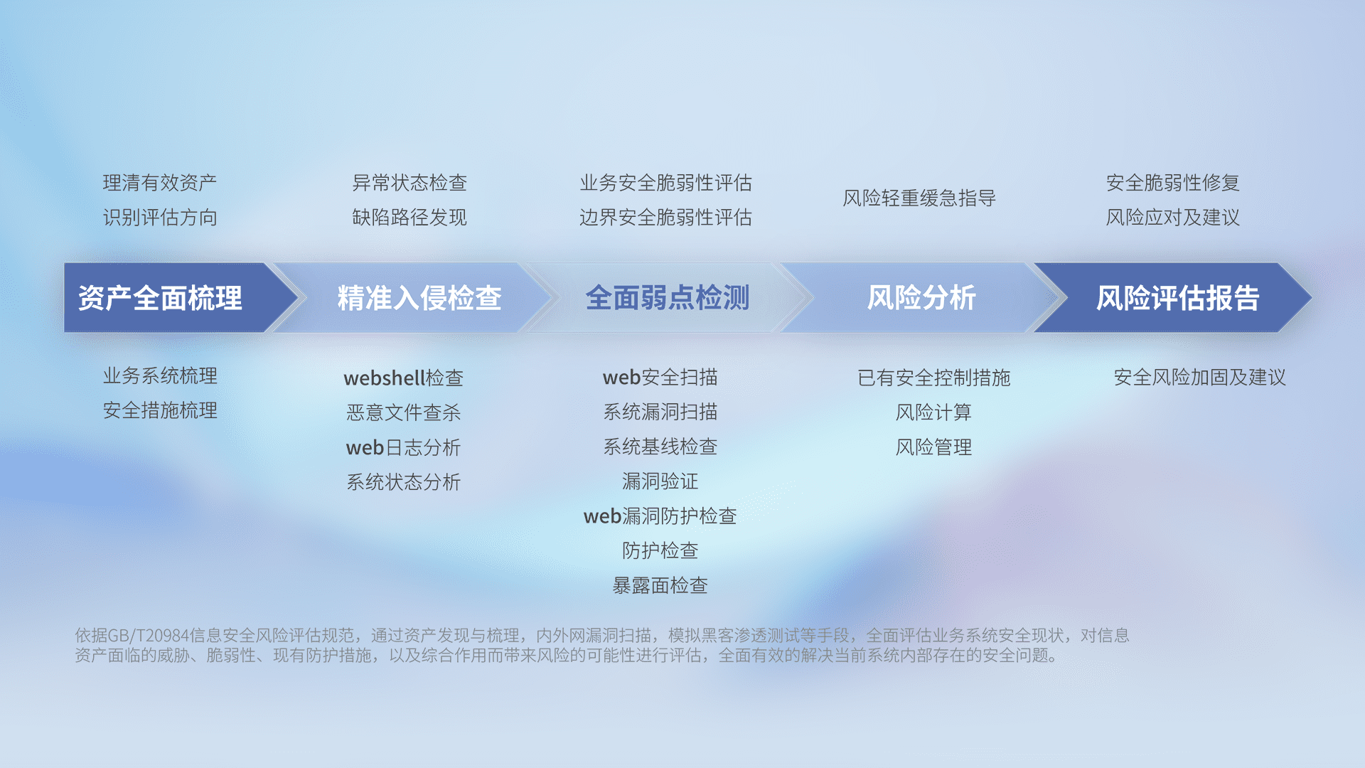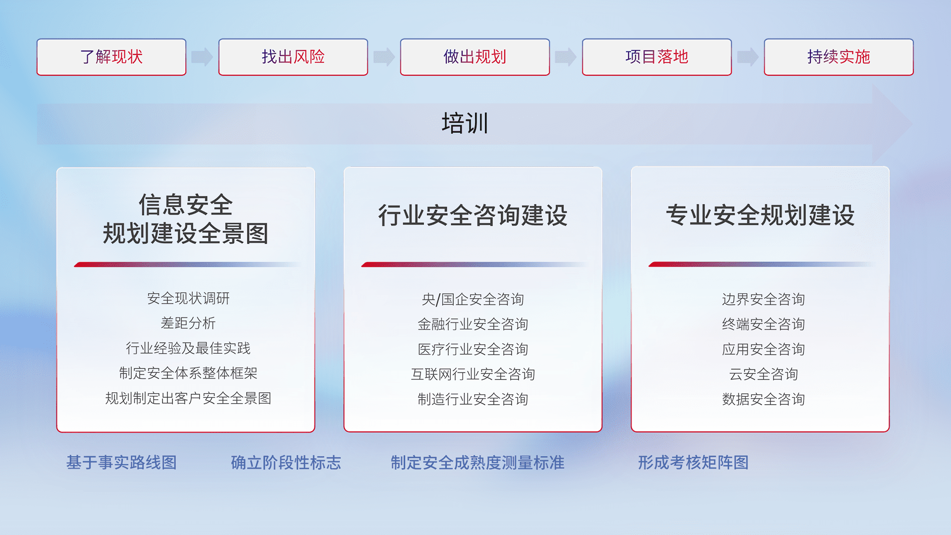 针对客户行业特性,,以专业的安全服务+多厂商联合解决方案提供专属的一站式安全管理服务,,,帮助客户全面感知网络空间威胁,,,,基于识别、、、检测、、分析、、、防护、、监测、、、响应的服务理论模型,,,,从方案咨询、、、、集成交付、、、评估验证、、优化加固、、、运维运营,,,,致力于为客户提供完整的闭环管理式安全服务。。。。以实战经验为客户打造高抵御风险的安全体系,,帮助客户发现威胁、、、、对抗威胁、、、处置威胁,,,,不断积累安全对抗能力,,持续保障数字化安全。。。。